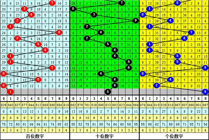 百位上期出现:热号0,该位蚁集十期以热号出现较多,以温号出现较少,现在百位热号有4个:0、1、5、7,本期看好开出热号再次出现,参考号码1。