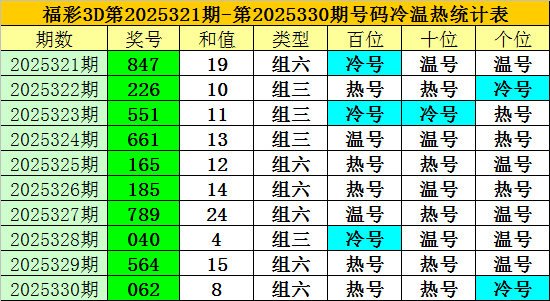 上期追想:福彩3D第2025330期开奖奖号为:062,奖号类型为:组六,奖号冷温热态为:热号+热号+冷号。